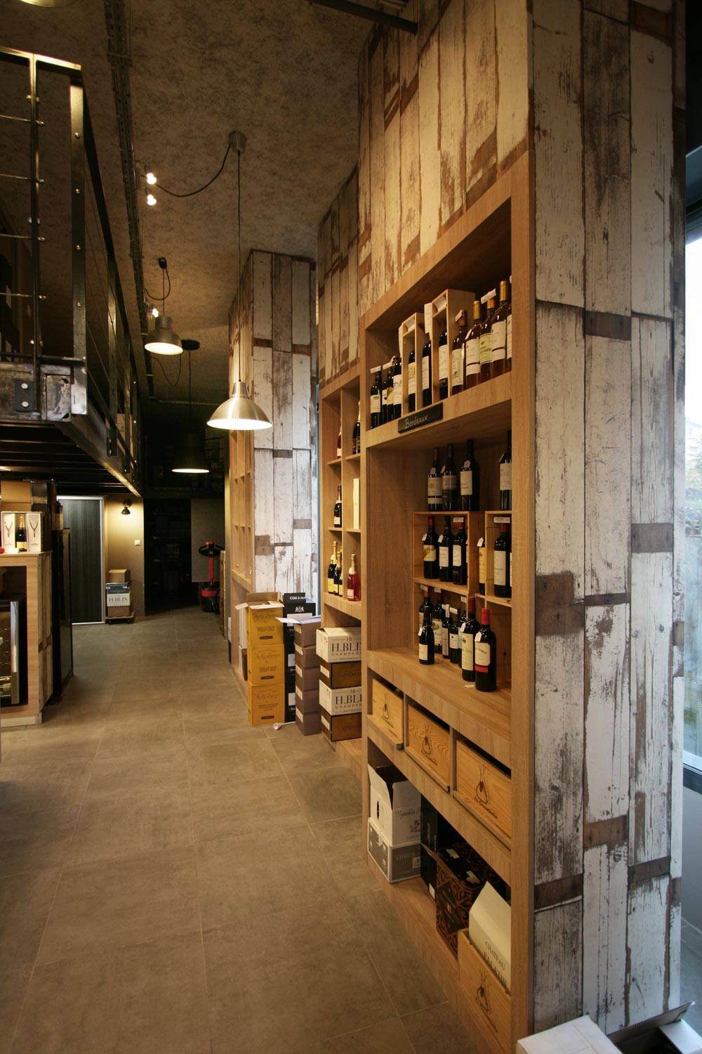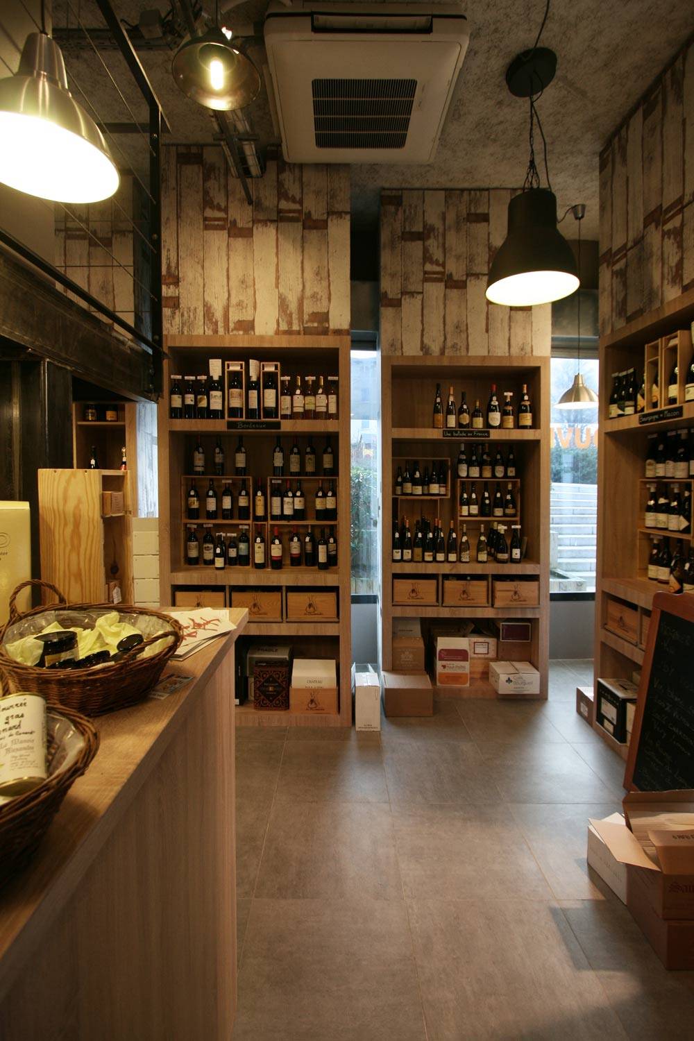 1 - Imaginer des colonnes de plus de 3 mètres de haut, décalées entre elles, évoquant pour certains une « forêt », ou pour d’autres des bibliothèques, tournant leur dos aux vitrines pour mieux protéger les centaines de références de vin proposées aux clients.