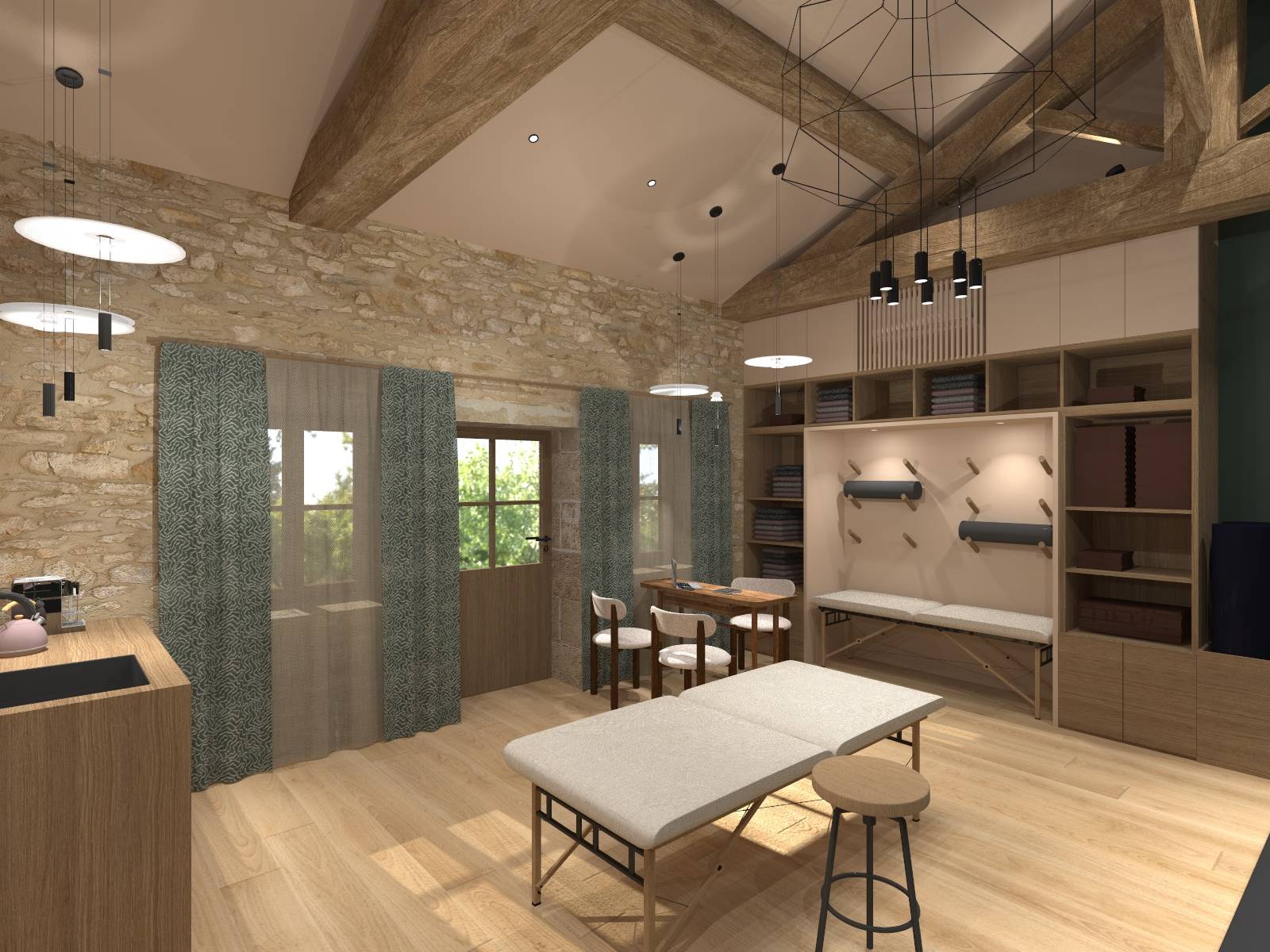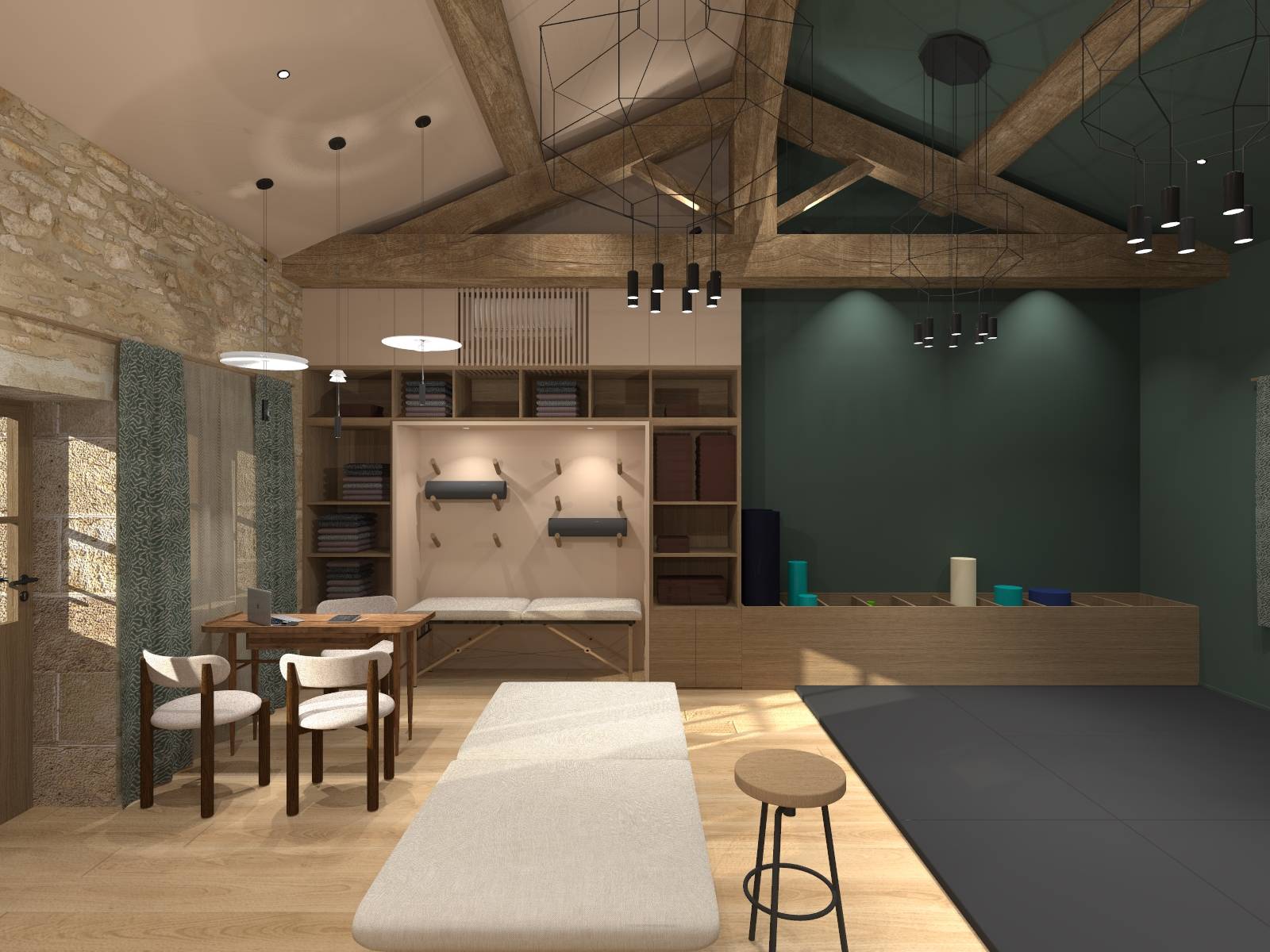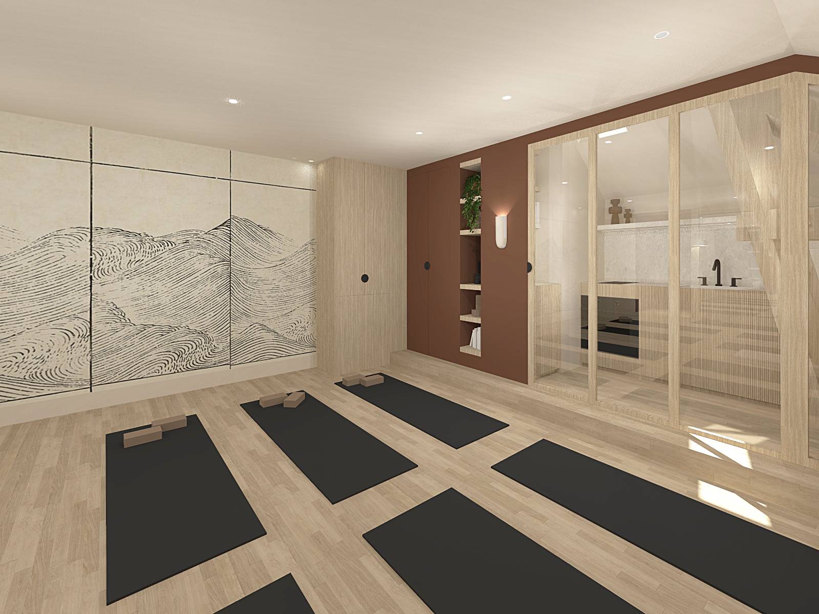 Un des principaux enjeux du projet était de traiter deux fonctions distinctes dans un même espace : les cours collectifs et les rendez-vous individuels. Pour répondre à ce besoin, nous avons utilisé la couleur de manière subtile pour diviser les deux zones tout en préservant une fluidité dans l’ensemble de la pièce.
