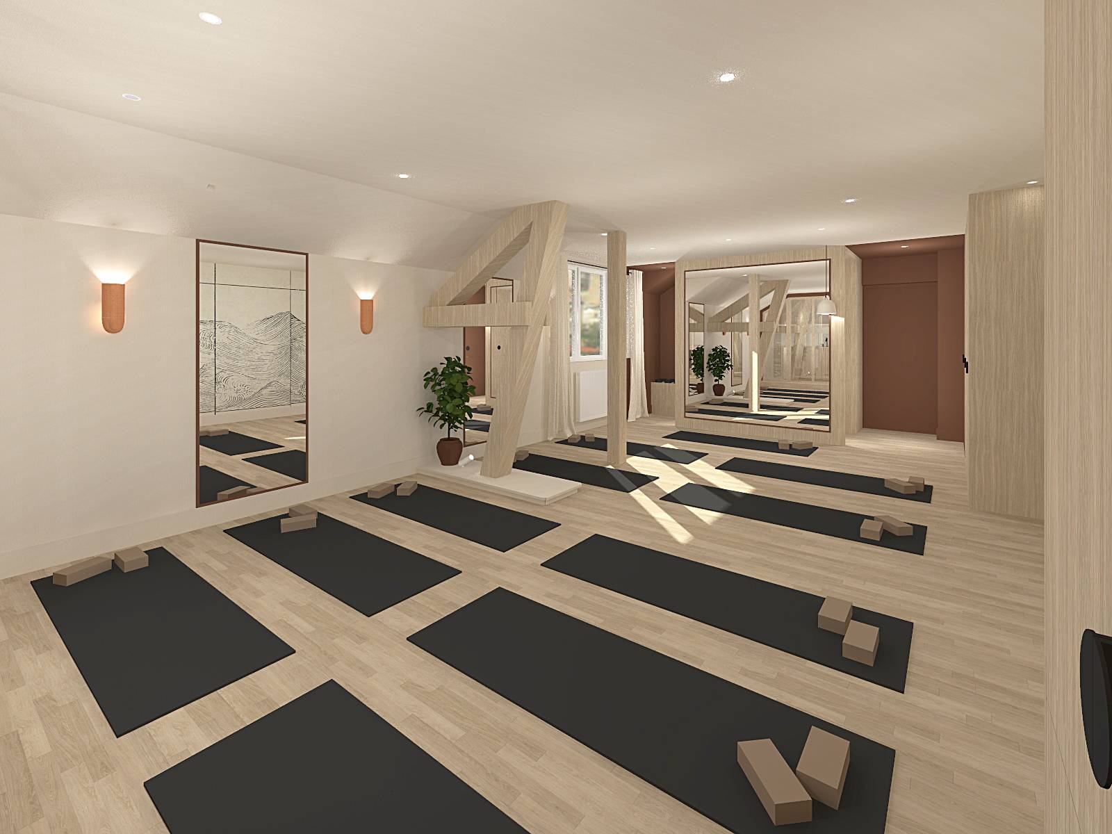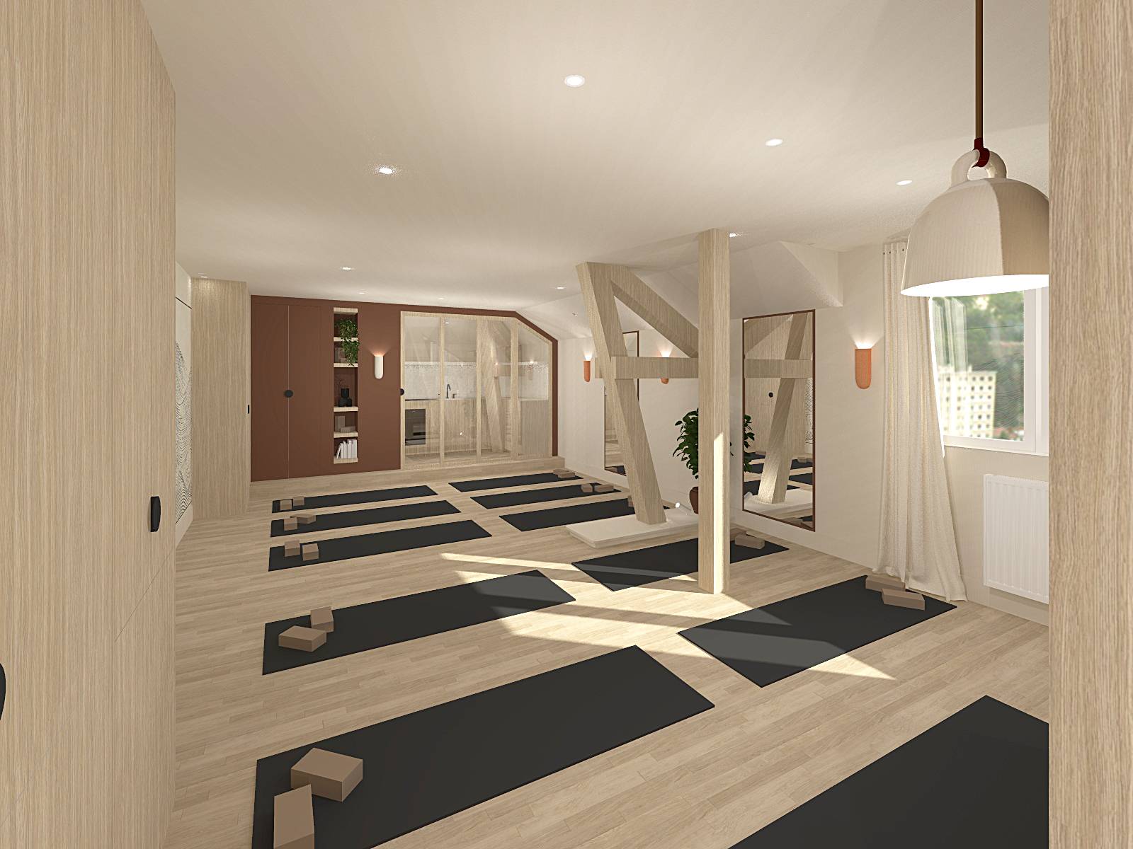 Le premier projet consistait à transformer un appartement situé dans un vieux bâtiment en une grande salle de yoga. Pour ce faire, nous avons repensé complètement l'agencement. En retravaillant le plan du logement et en revoyant l’emplacement du coin cuisine et de la salle de bain, nous avons réussi à optimiser et agrandir l’espace pour répondre aux besoins d’une grande salle dédiée à la pratique du yoga.