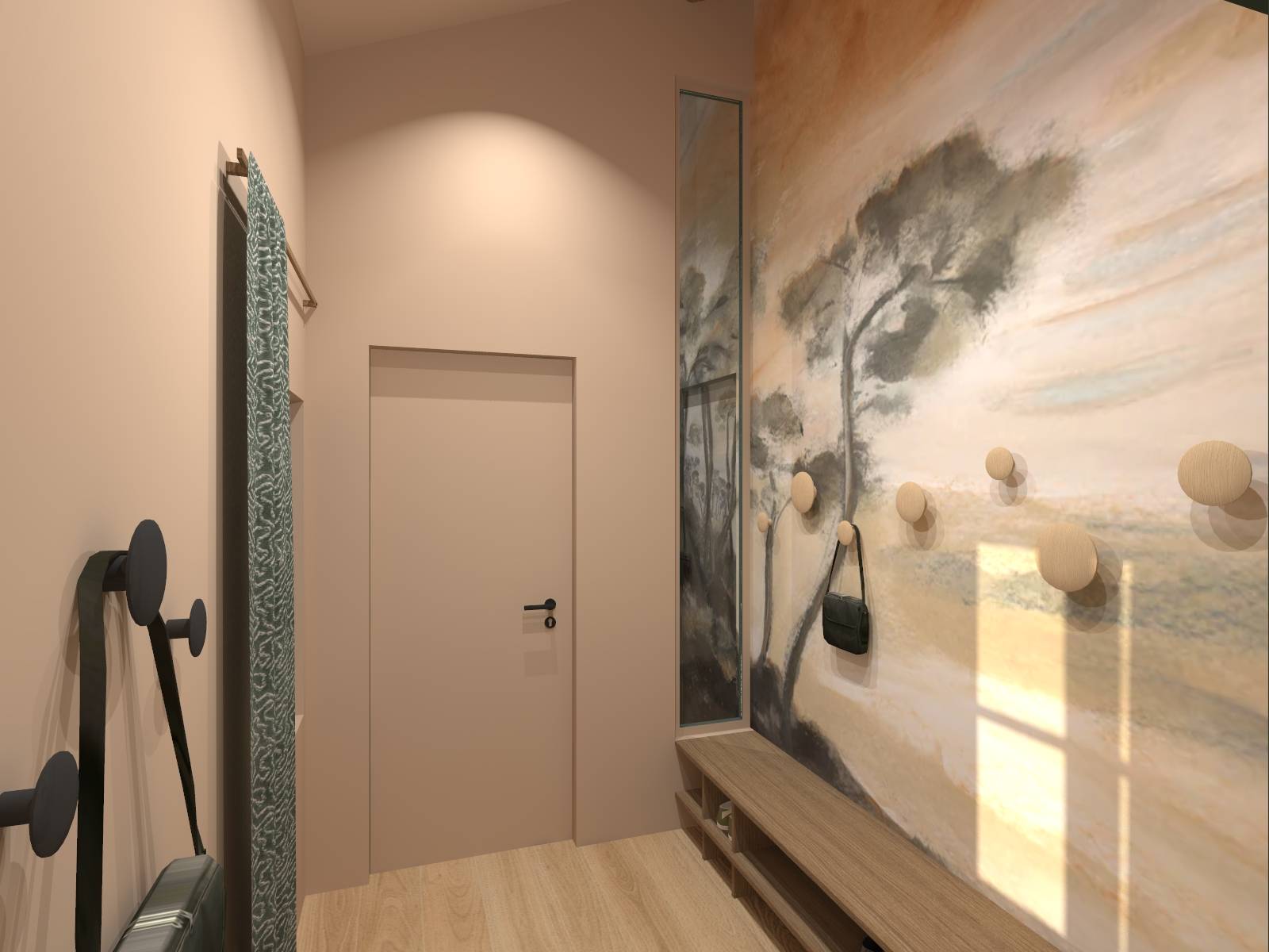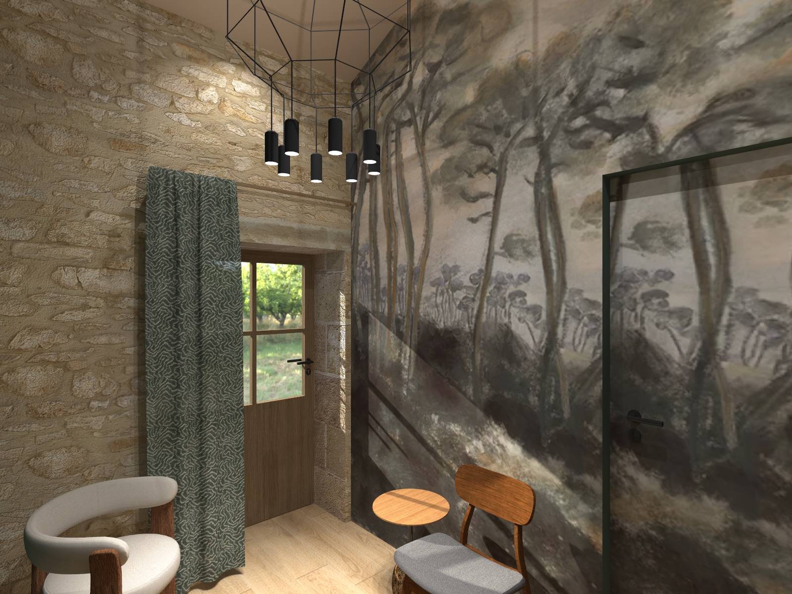 L’ambiance générale du projet se veut sobre et épurée, parfaitement adaptée à l’usage de l’espace. La décoration minimaliste, aux teintes naturelles, crée une atmosphère zen, propice à la détente. Le choix du papier peint, avec ses courbes et ses couleurs apaisantes, complète l'ensemble en renforçant cette sensation de calme et de sérénité.