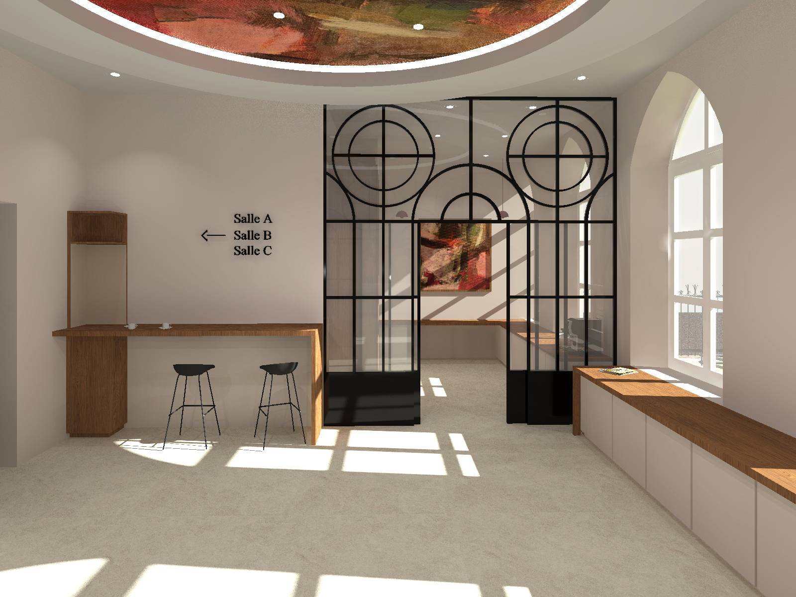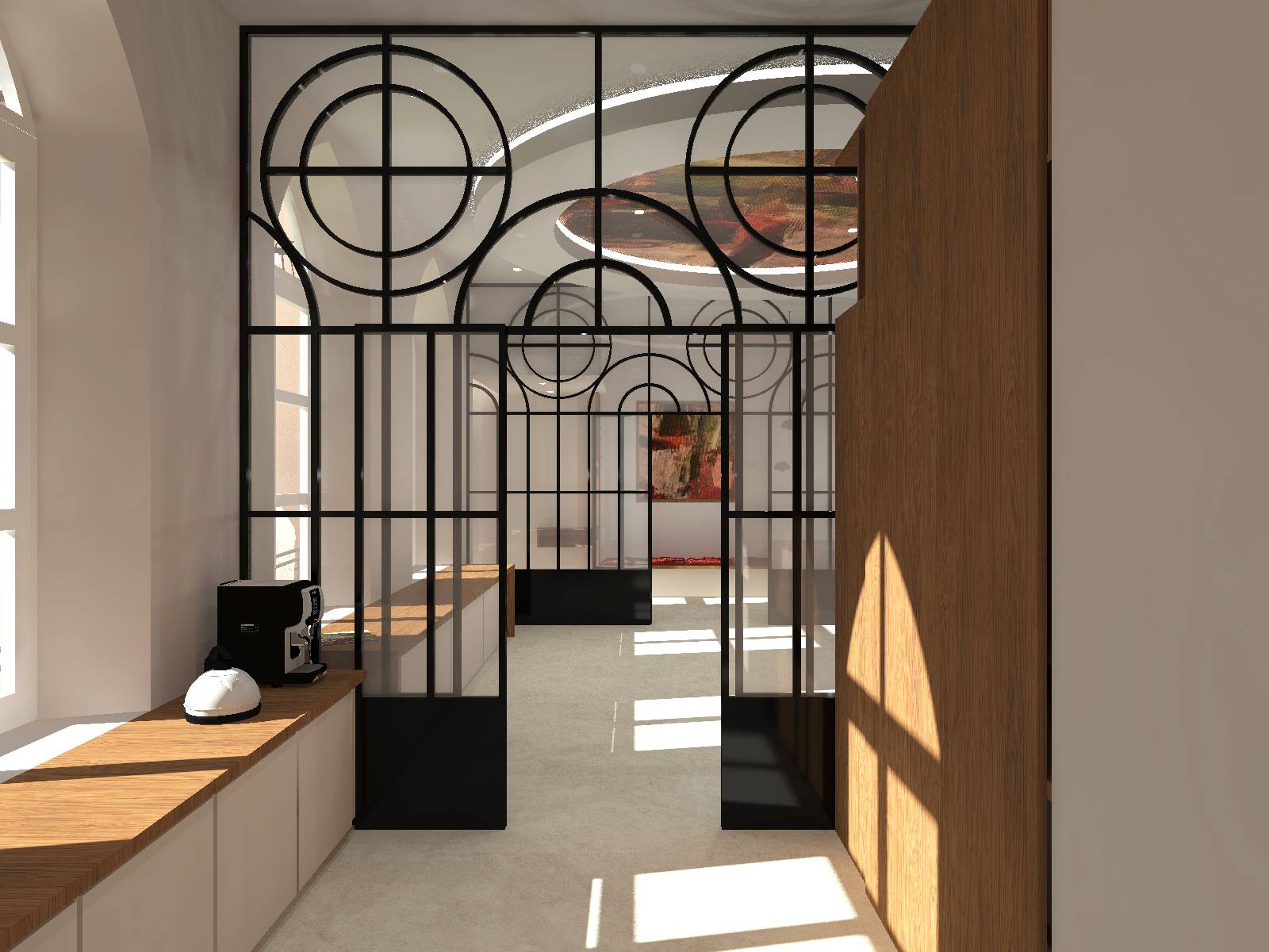Conçue en acier, elle reprend les motifs ornementaux déjà présents dans l’architecture d’origine. Élément central du projet, elle s’intègre à l’espace comme une véritable œuvre d’art, créant un dialogue subtil entre histoire et modernité, entre contemplation et usage quotidien.