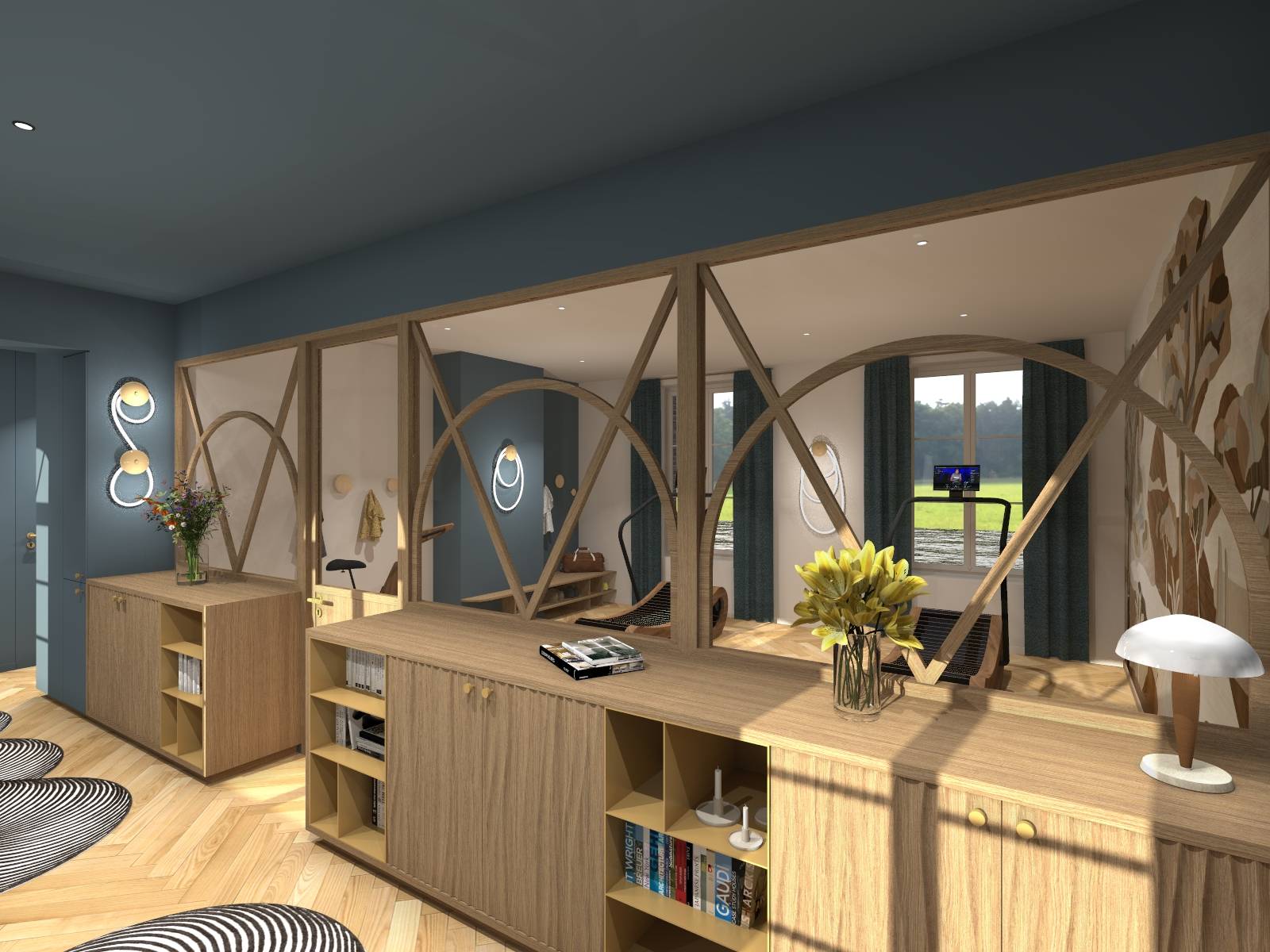 Le détail qui fait la différence ? Le motif du vitrage, inspiré des impostes des fenêtres du couloir attenant. Un clin d’œil subtil mais assumé, qui relie visuellement les espaces et renforce l’identité architecturale de l’ensemble. Depuis la salle de sport, cette mise en écho crée une perspective poétique et cohérente.