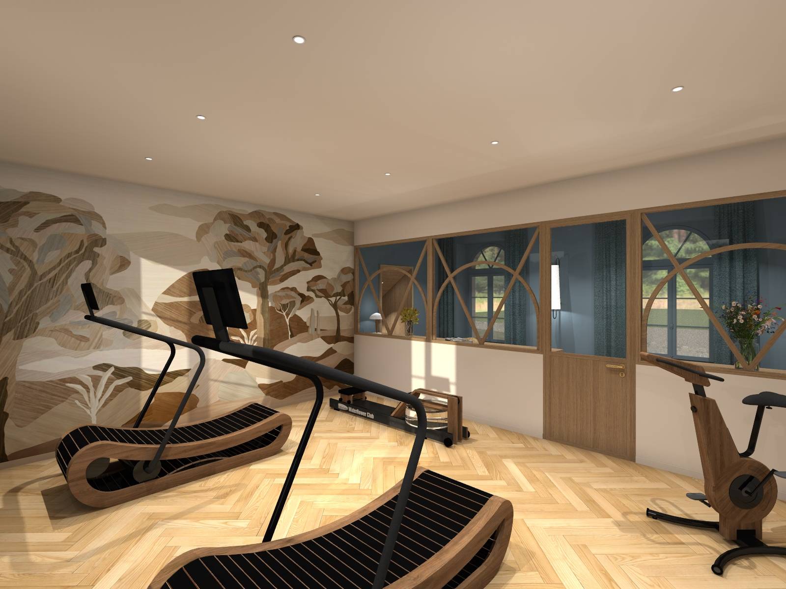 les verrières structurent sans cloisonner. Elles viennent délimiter la salle de sport tout en laissant passer la lumière et en préservant la fluidité des volumes. Le choix d’une structure en bois s’impose naturellement, dans la continuité du lieu, pour