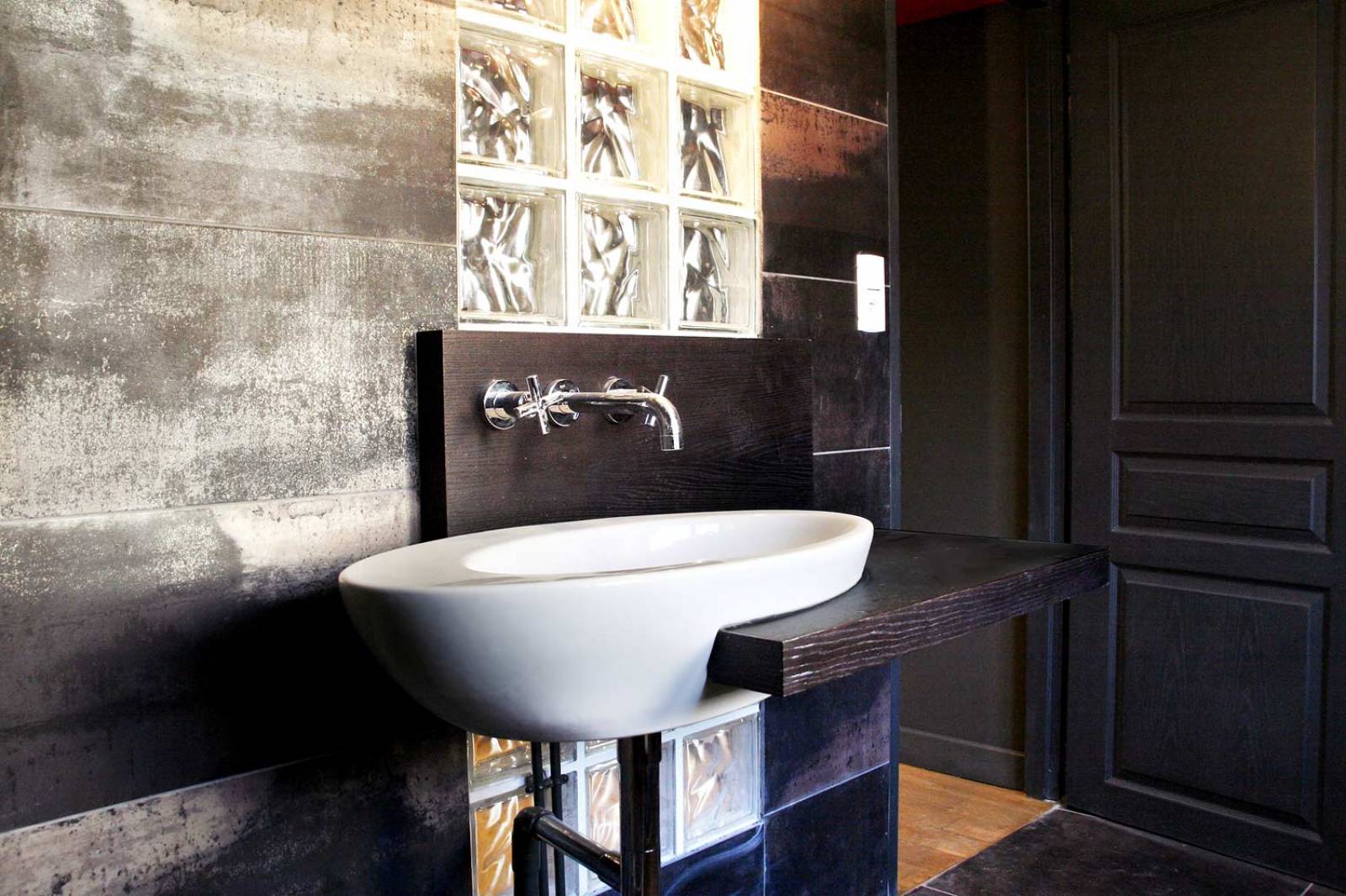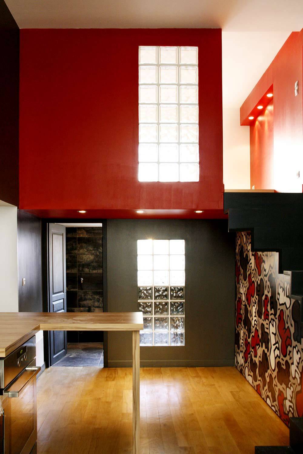 3 - Dans un deuxième espace, séparé par un mur porteur ouvert afin d'aérer l'appartement, imaginer une boîte "chambre à coucher" fermée au-dessus de la salle de bain. Pour conserver les apports de lumière traversant et jouer sur les volumes, réaliser des ouvertures en pavés de verre et relier ces 2 espaces par un jeu de couleurs rouge et gris anthracite auquel est associé un visuel imprimé sur les portes du placard sous l’escalier de la chambre.