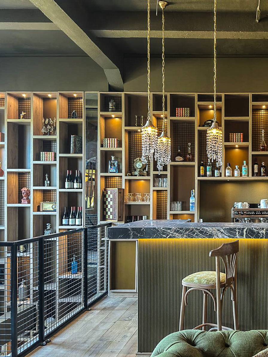 La couleur verte, dans ses nuances profondes, est idéale pour adoucir l’atmosphère. Ici, nous avons misé sur des tons verts chaleureux, qui créent un effet enveloppant. Utilisées sur les murs, les assises ou les textiles, ces teintes s’associent parfaitement à des matières comme le cuir, le métal foncé ou encore le laiton. Le résultat : une ambiance chic et intemporelle, où chaque élément dialogue avec l’autre. Ces choix contribuent à façonner un espace apaisant et inspirant, dans lequel on a naturellement envie de s’attarder, de partager un moment.