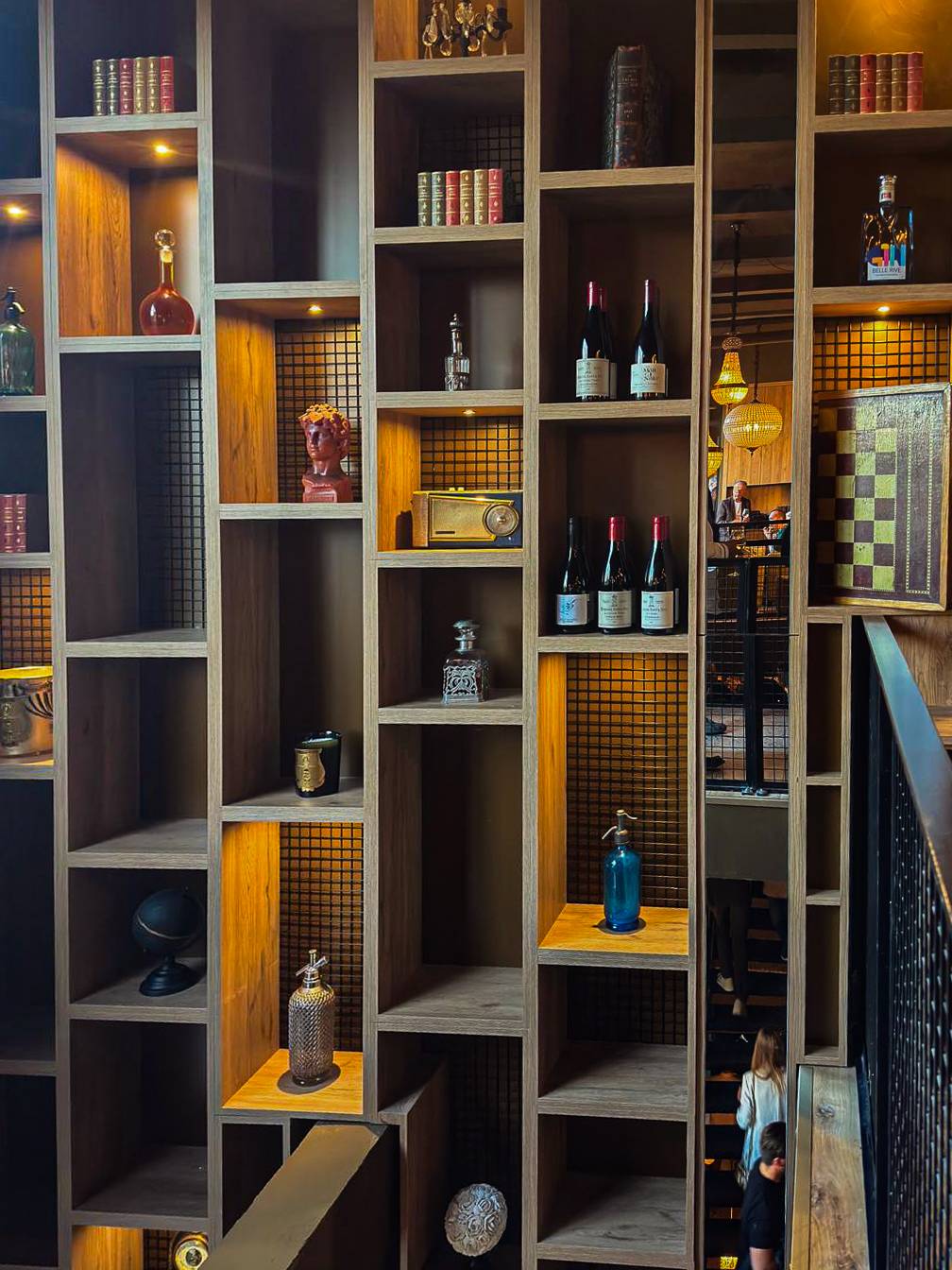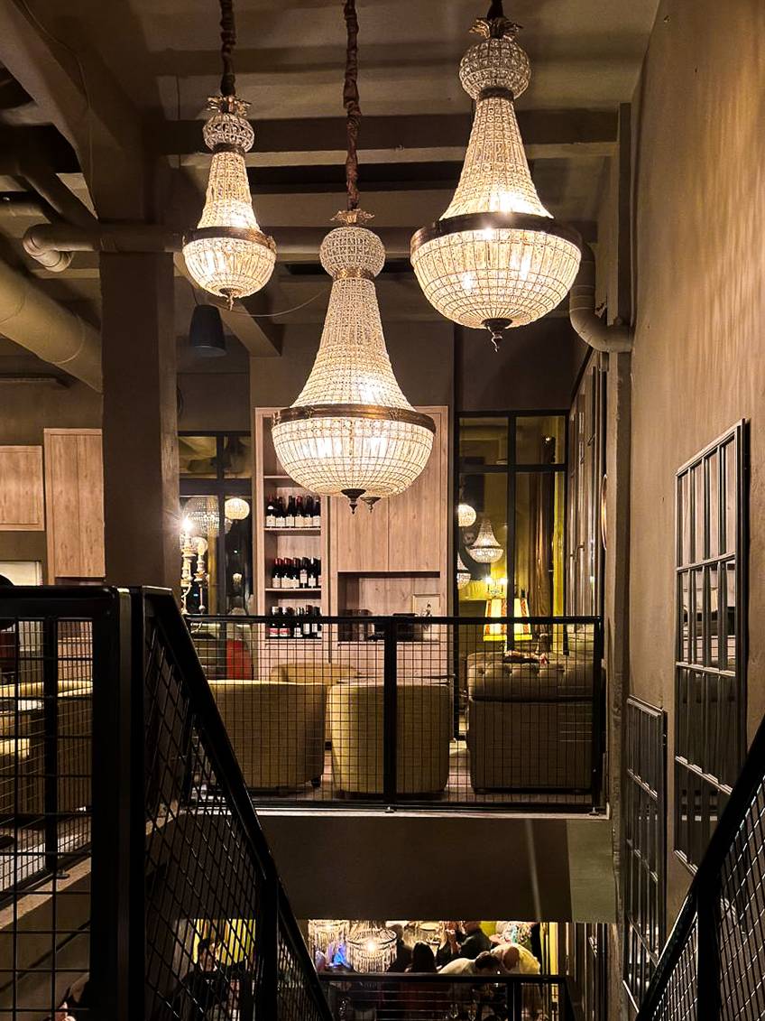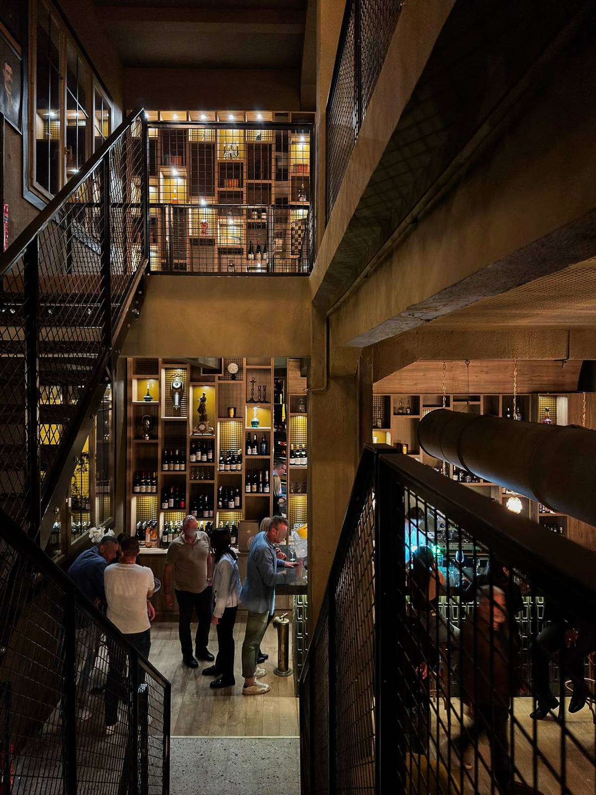 L’installation d’un parastage toute hauteur, positionné derrière les bars de chaque étage, joue un rôle central. L’ouverture de la dalle au premier renforce la continuité entre les niveaux et accentue les jeux de perspectives, apportant une dimension verticale marquante.