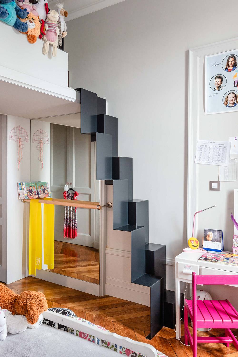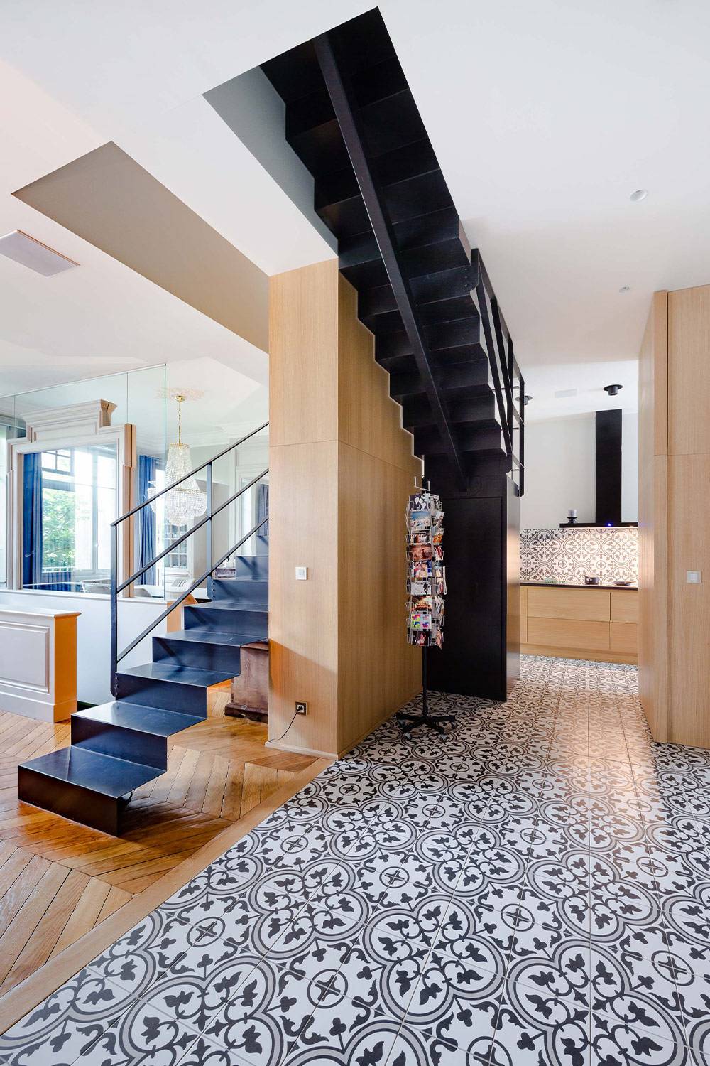 rénovation d'un appartement bourgeois en triplex à Lyon. Les missions principales de notre équipe d'architectes d'intérieur ont été de redéfinir les espaces et la circulation au sein de ce bel appartement bourgeois. Pour faire le lien entre tous les niveaux de cet appartement, Stéphane MILLET et son équipe ont opté pour un escalier en acier enroulé autour d'un pilier central. A l'étage des espaces de vie, l'escalier structure l'espace en servant de séparation entre la cuisine et le salon.