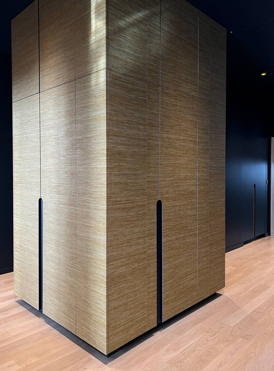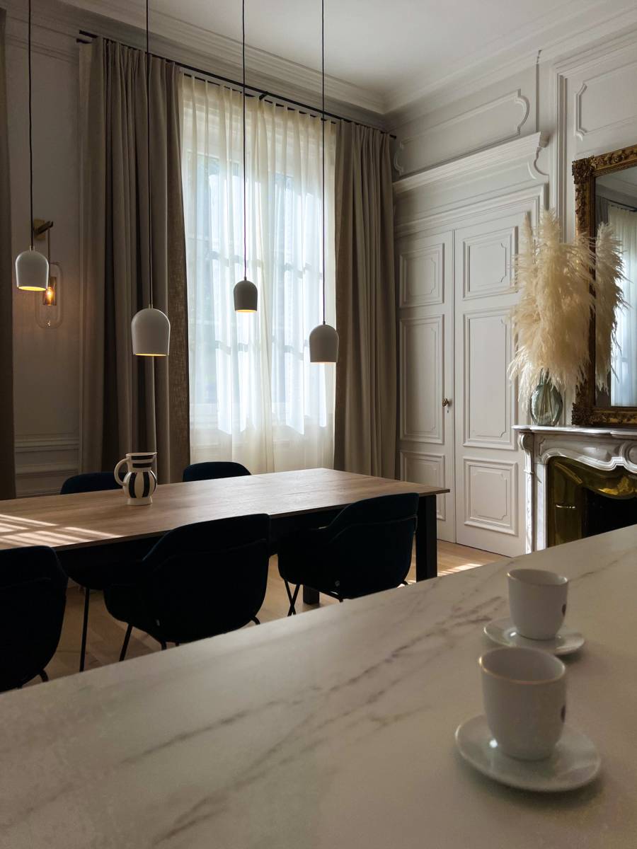 ARCHITECTURE D’INTÉRIEUR HAUT DE GAMME POUR PARTICULIERS :1 - Concevoir un hall d'entrée foncé, qui contraste avec les autres pièces de l'appartement : La première étape consistait à créer un hall d'entrée avec des tons sombres. Ce choix audacieux visait à offrir un contraste marqué avec les pièces adjacentes, mettant en valeur l'espace tout en créant une première impression forte et élégante. Ce hall d'entrée, ainsi distingué, devient un espace de transition entre l'espace jour et l'espace nuit. 2 - Imaginer dans le hall un cube central, pour organiser la circulation, cacher un gros pilier porteur et concevoir de nombreux rangements : Cette structure ingénieuse non seulement masque un élément porteur, mais elle réorganise aussi la circulation dans l'appartement. En intégrant des placards discrets, elle optimise le rangement tout en conservant une esthétique épurée.3 - Exploiter les caractéristiques distinctives de l'architecture haussmannienne pour hiérarchiser les espaces de vie : La cuisine, nichée dans l'alcôve, permet de dissimuler les éléments techniques, offrant ainsi un îlot central d'une sobriété raffinée. Cette disposition crée une atmosphère douce et intime, pour celui ou celle qui cuisine, tout en bénéficiant de la lumière abondante de la salle à manger adjacente.