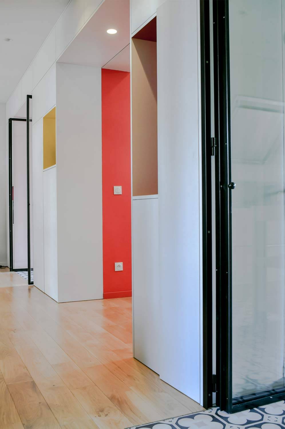 1 - Opter pour un décloisonnement total au rez-de-chaussée afin de recréer un découpage en « croix » des espaces : salon, salle à manger, cuisine, bureau. Les espaces sont semi-ouverts avec des jeux de transparence et des agencements traités et hiérarchisés par la couleur.