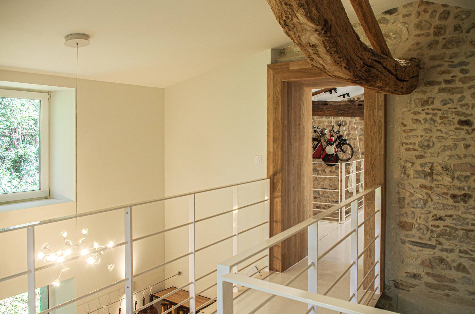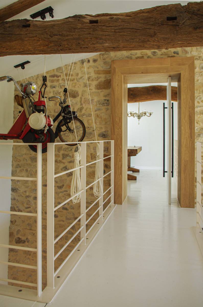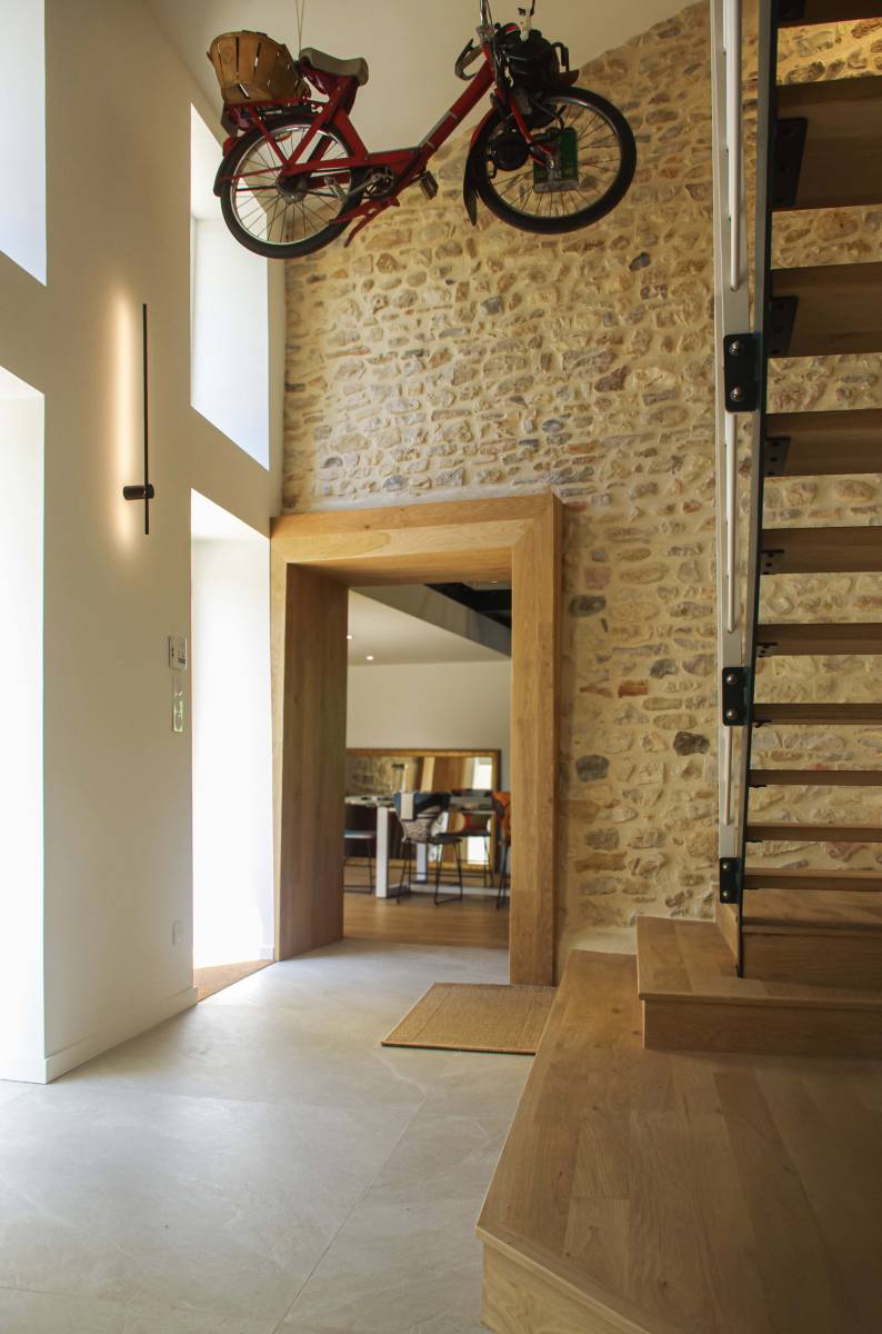 Dès l’entrée, un volume généreux nous accueille. Habituellement simple espace de transition, l’entrée devient ici un lieu d’exposition à part entière, agréable et lumineux, qui invite à la déambulation. L’escalier, à l’esthétique contemporaine, dialogue harmonieusement avec la rusticité des pierres.