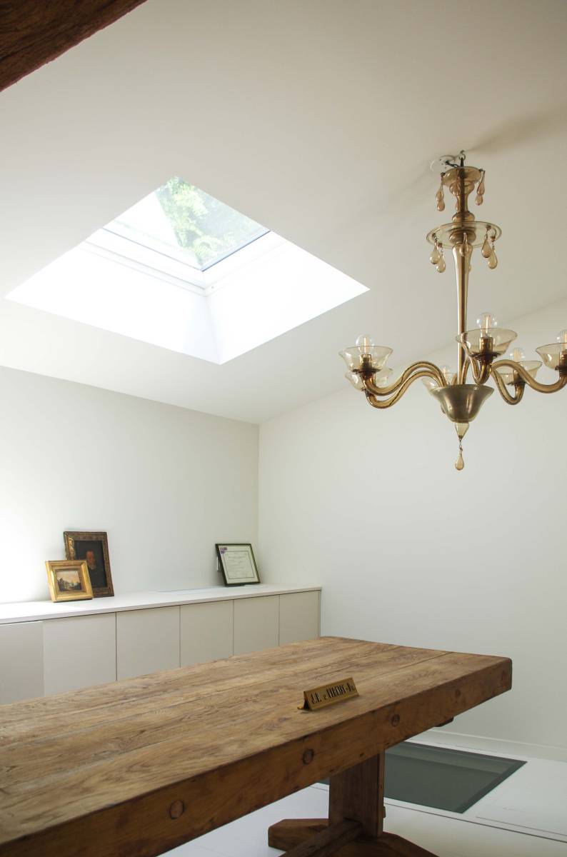 À l’étage, des passerelles suspendues animent la circulation. Elles surplombent le rez-de-chaussée, multipliant les points de vue et les jeux de perspective. Cette configuration renforce la sensation d’ouverture et de légèreté, au cœur même de cette bâtisse ancienne.