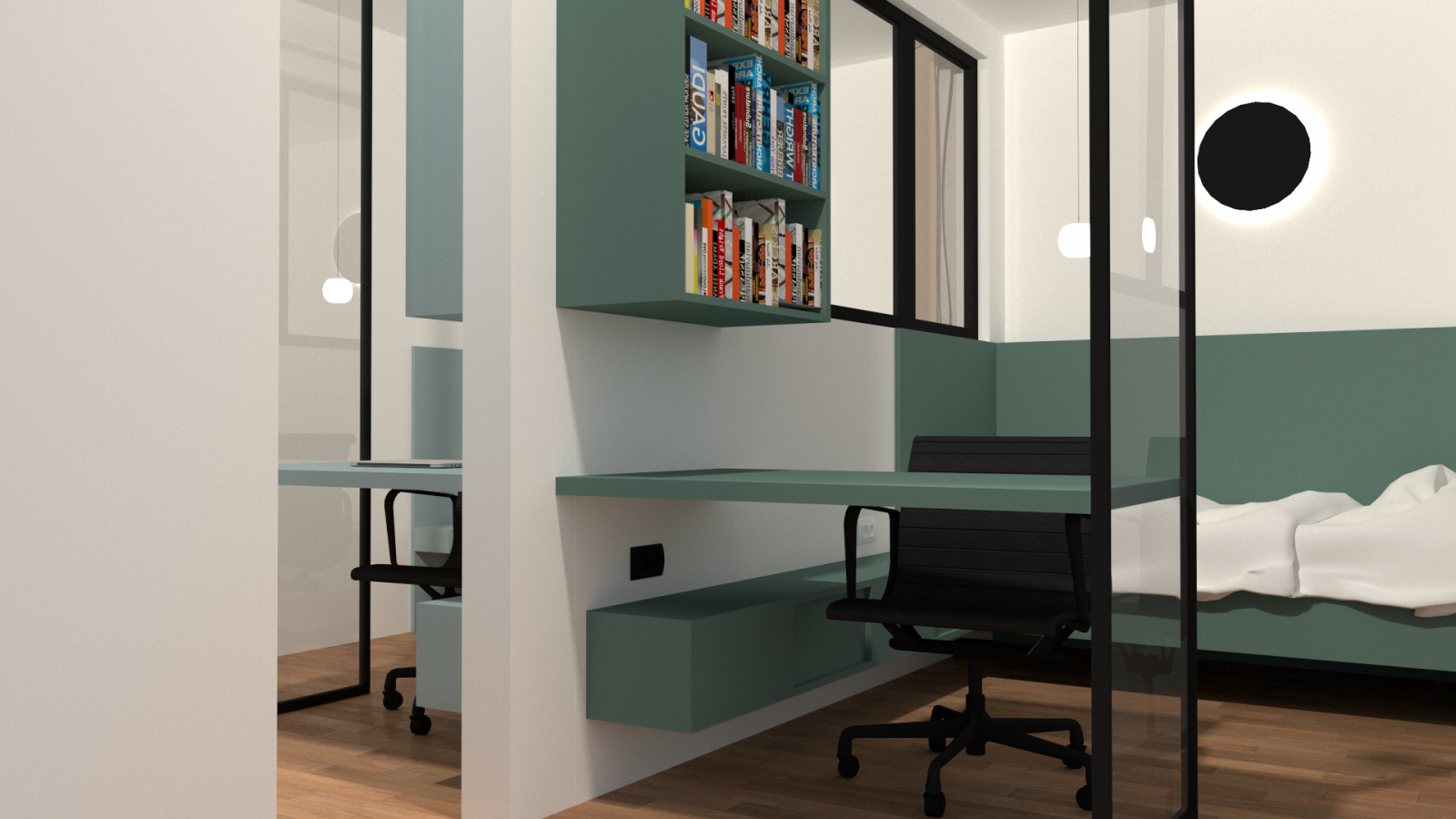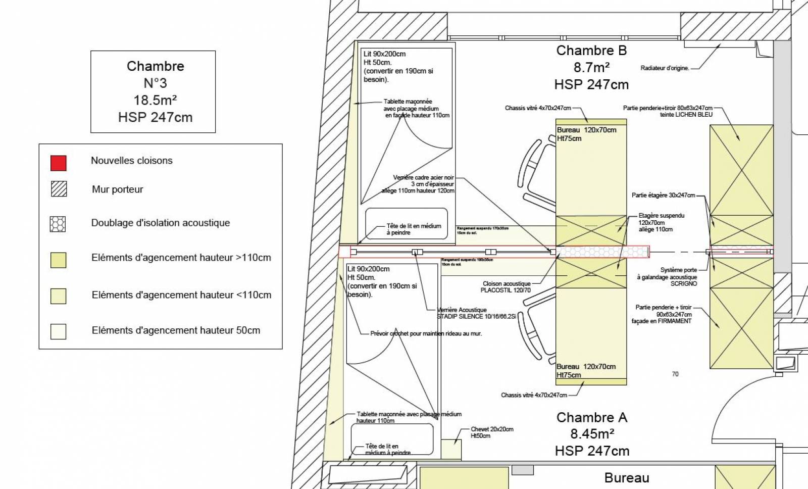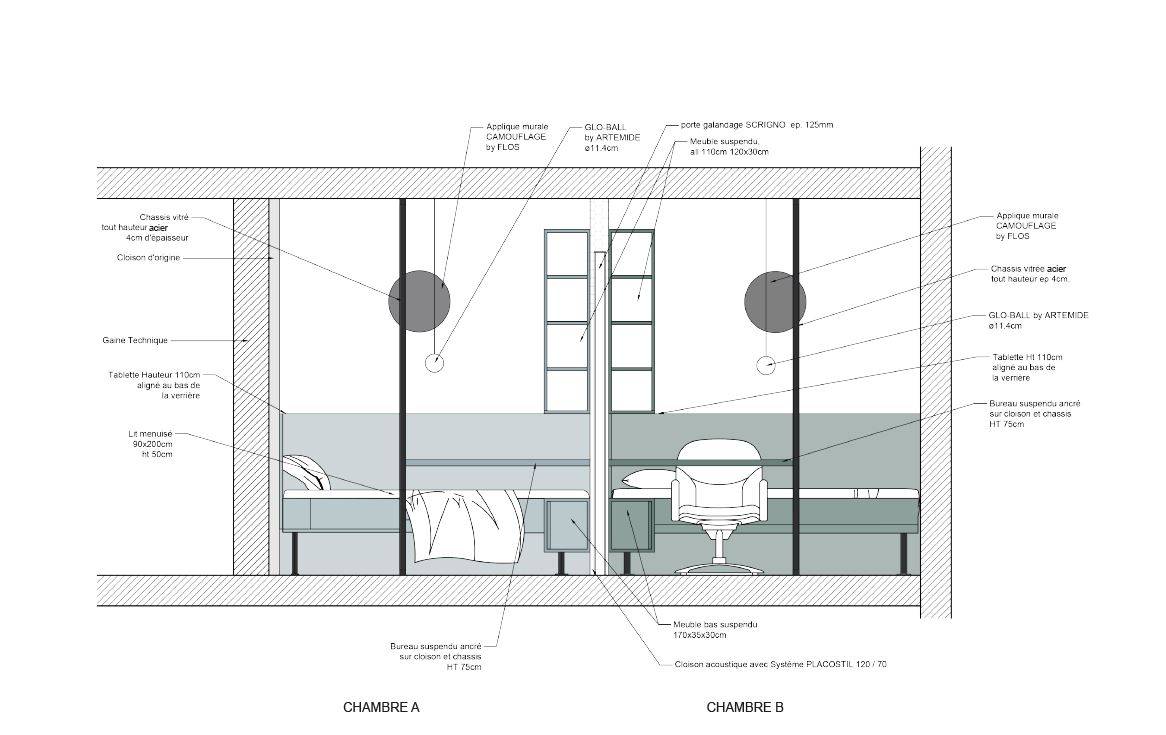 redécouper l'espace en deux zones symétriques, qui puissent contenir à chaque fois tous les usages nécessaires : rangement, travail et sommeil. Une verrière a été pensée entre les deux espaces pour que chacun d'eux profite de la lumière naturelle.