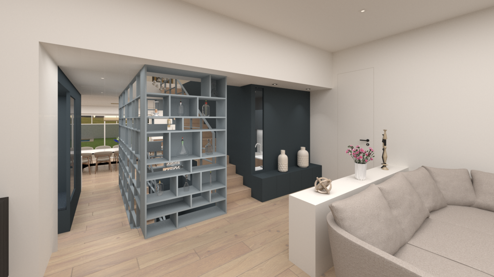 Un claustra en bois renforce la continuité et la cohérence du design. Assorti aux étagères, il structure l'espace tout en laissant passer la lumière, créant une atmosphère aérée et lumineuse.