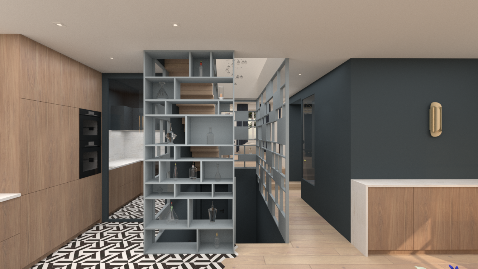 Un escalier avec étagères intégrées et claustra :